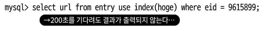 그림 2.2의 use index(hoge)는 일부러 인덱스를 태우지 않고 쿼리를 던지고 있는 예인데, 1️⃣ 검색하는 데 200초가 경과해도 검색 결과가 나오지 않습니다.