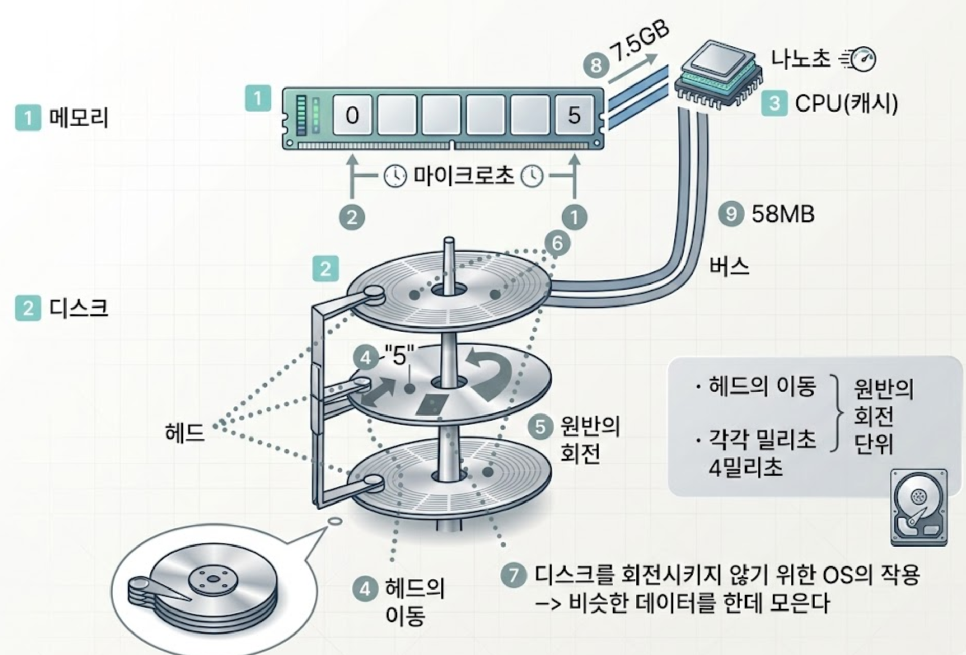 디스크에서는 ❹ 헤드의 이동과 ❺ 원반의 회전이라는 두 가지 물리적인 이동이 필요합니다. 오늘날의 기술로도 원반의 회전속도를 빛의 속도에 가깝게 만들 수는 없습니다. 디스크에서는 ❹, ❺ 각각 밀리초 단위, 합해서 수 밀리초가 걸립니다. 메모리는 1회 탐색할 때 마이크로초면 되지만 디스크는 수 밀리초가 걸리는 것입니다.