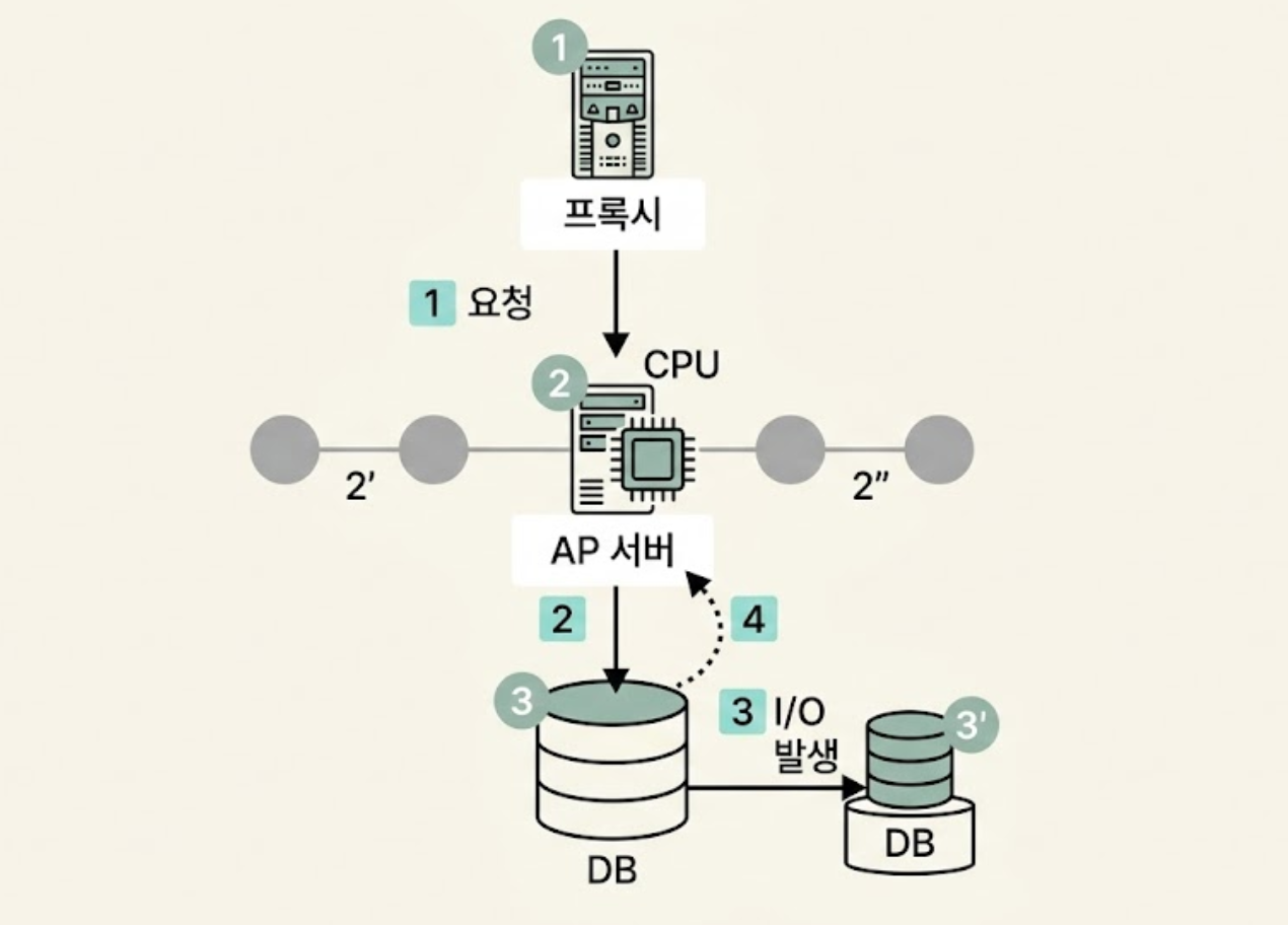 웹 애플리케이션과 부하의 관계를 그림으로 보면 그림 2.5의 3단 구조에는 프록시 ❶, AP 서버 ❷, DB ❸이 있습니다. 웹 애플리케이션에 그림 2.5의 ❶, ❷라는 요청이 오고 ❸ DB에 도달해서 I/O가 발생하고, 이 I/O가 발생해서 되돌아온 콘텐츠를 변경한 후 그림 2.5의 ❹처럼 클라이언트로 응답합니다. 기본적으로 ❷ AP 서버에는 I/O 부하가 걸리지 않고 ❸ DB 측에 I/O 부하가 걸립니다.
