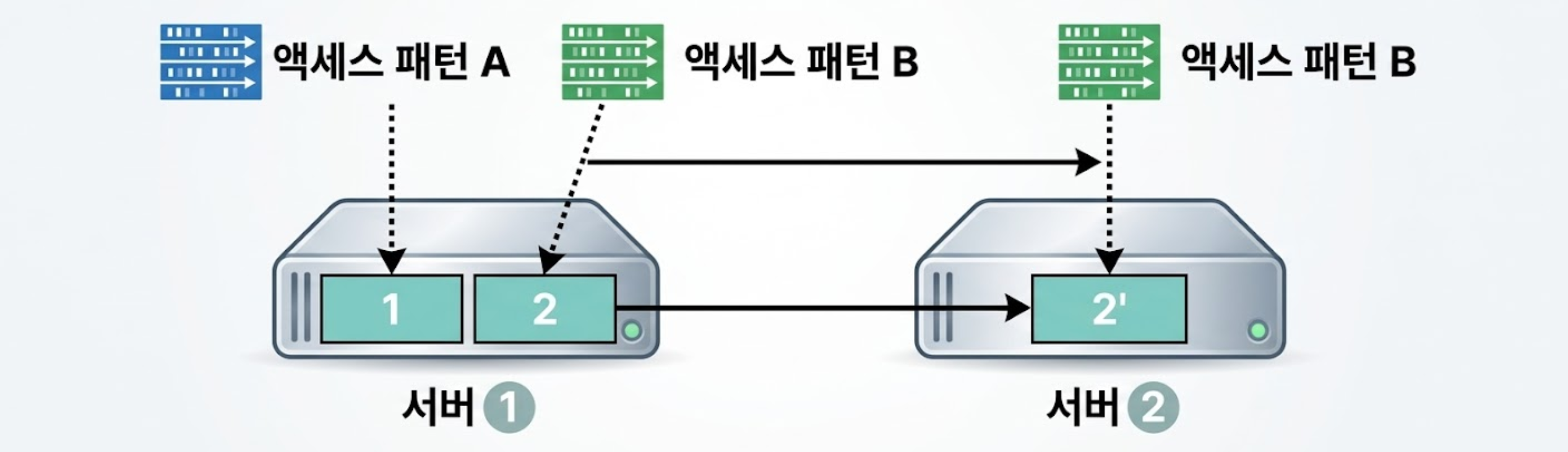 그림 3.12의 ❶ DB 서버에 액세스 패턴 A일 때는 1️⃣로 액세스가 많이 오고, 액세스 패턴 B일 때는 2️⃣로 오는 것처럼 데이터로 액세스하는 경향에 대한 처리 방식에 따라 특정한 방향으로 치우치는 경우가 자주 있습니다.