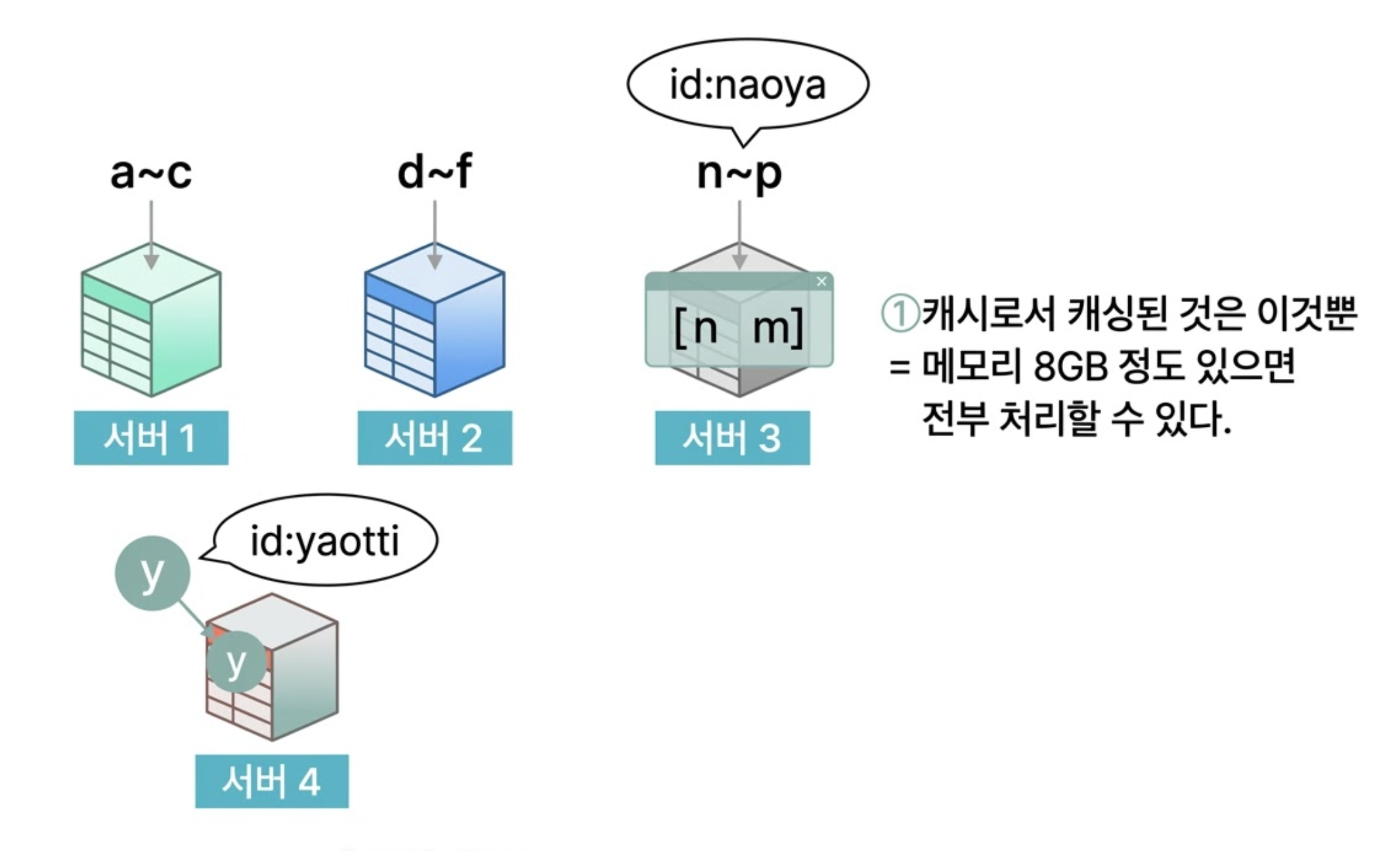 예를 들어 ID의 첫 문자가 a~c인 사람의 데이터는 그림 3.14의 서버 1️⃣, d~f인 사람의 데이터는 서버 2️⃣와 같이 나눕니다. id:naoyan~p인 서버 3️⃣으로 결정되었고, id:yaottiid:naoya와는 다른 서버 4️⃣에 있습니다.