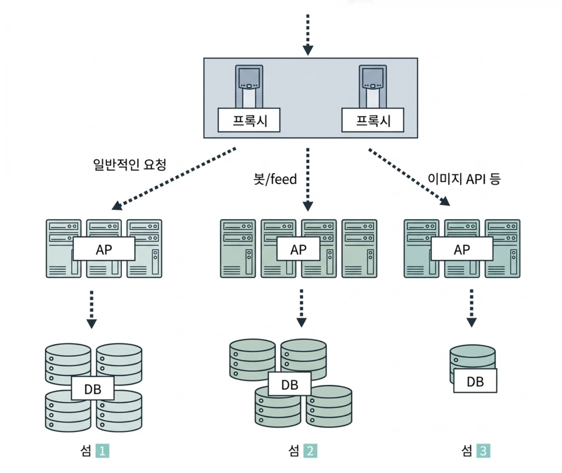 이렇게 해서 캐싱하기 쉬운 요청, 캐싱하기 어려운 요청을 처리하는 섬을 나누게 되면 전자는 국소성으로 인해 안정되고 높은 캐시 적중률을 낼 수 있게 됩니다. 후자의 요청이 전자의 캐시를 어지럽히므로 섬으로 나누지 않는 경우에 비해 전체적으로 캐시 효율이 떨어지게 됩니다.