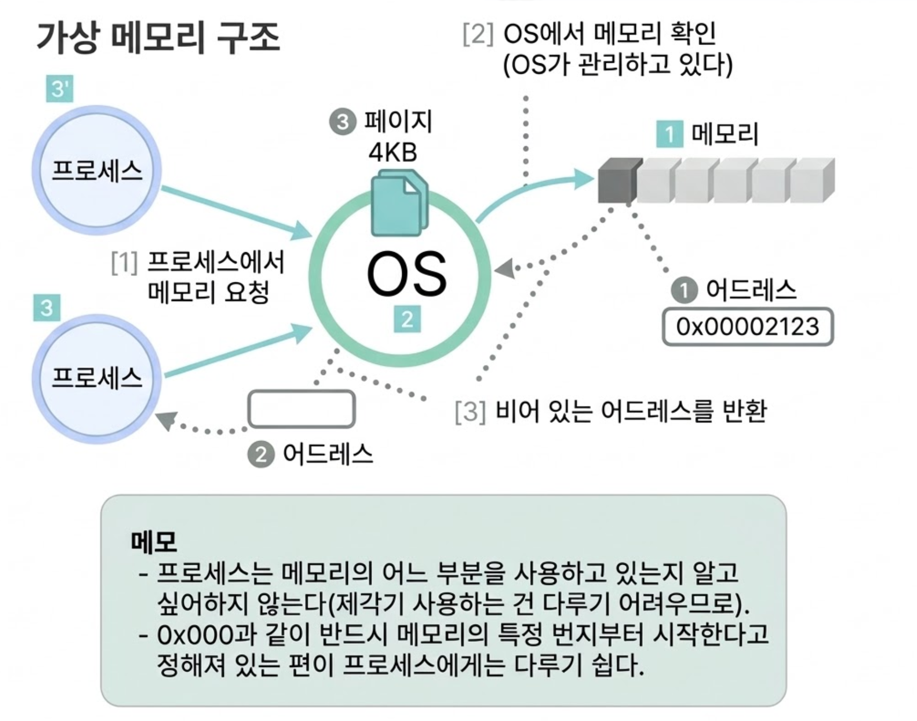 그 이유는 개별 프로세스에서는 메모리의 어느 부분을 사용하는지 관여하지 않고, 반드시 특정 번지부터 시작 또는 0x000부터 시작 하는 것으로 정해져 있으면 다루기 쉽기 때문입니다.