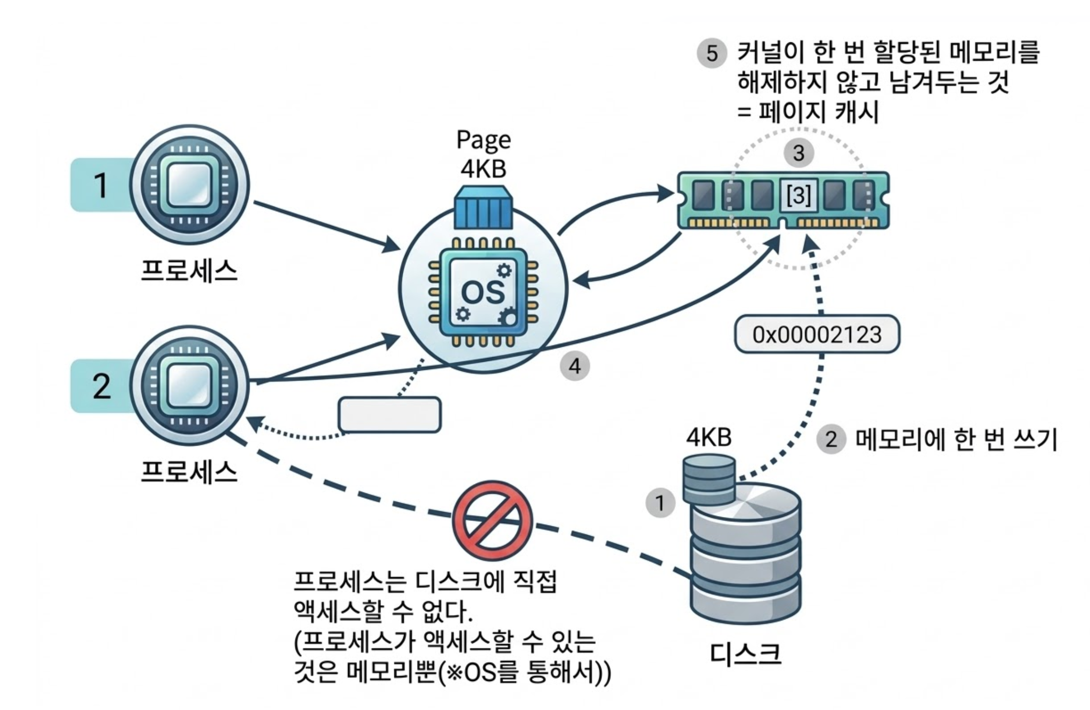여기서는 파일 캐시보다 페이지 캐시라고 하겠습니다. 그 이유는 뒤에서 설명하듯 Linux는 파일 전체가 아니라 페이지 단위로 디스크를 캐싱하기 때문입니다.