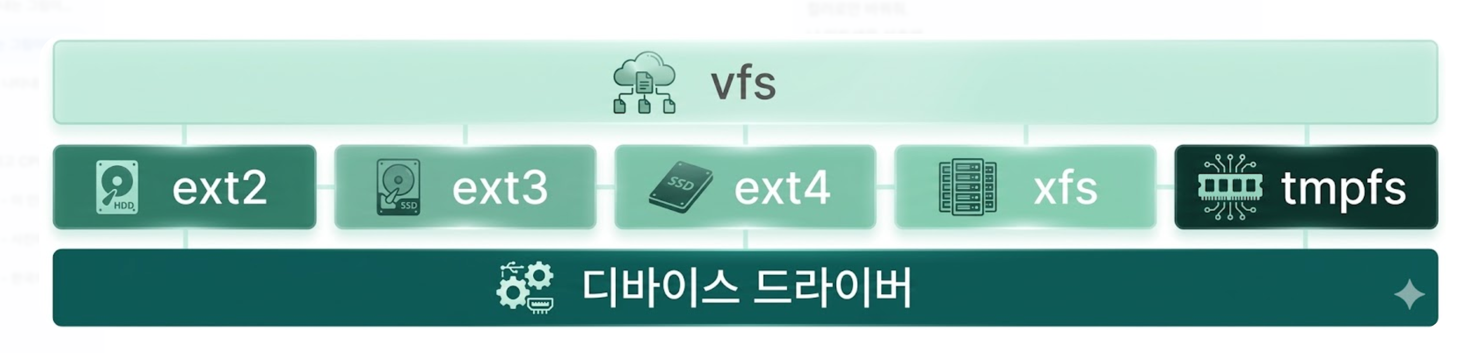 이렇듯 디스크의 캐시는 페이지 캐시에 의해 제공되지만, 실제 이 디스크를 조작하는 디바이스 드라이버와 OS 사이에는 파일시스템이 끼어 있습니다.