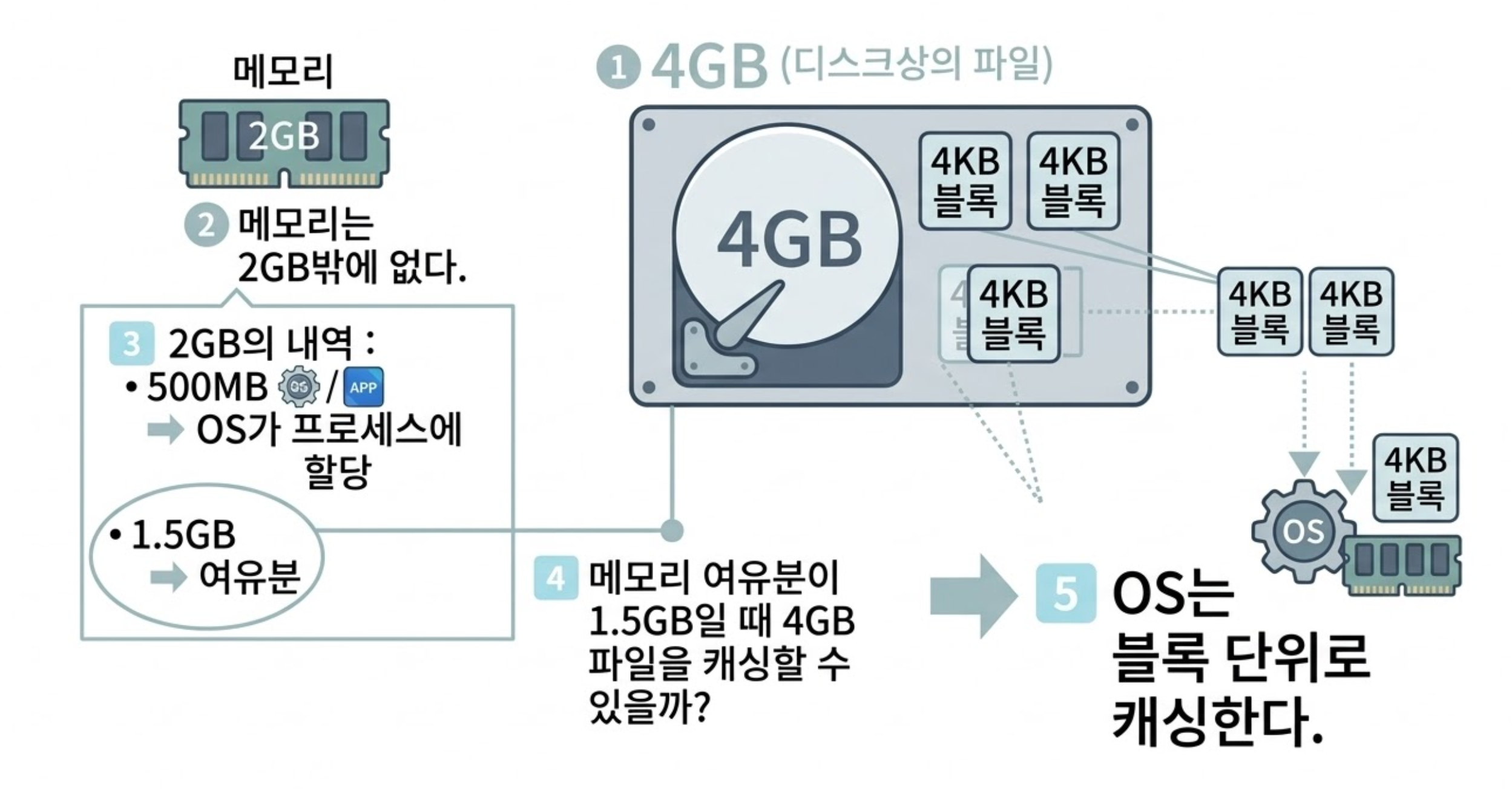 파일 캐시라고 생각한다면 파일 1개 단위로 캐싱하고 있다는 이미지를 주므로 4GB는 캐싱할 수 없다고 생각할 수 있지만, 실제로는 그렇지 않습니다. OS는 그림 3.5의 ❺와 같이 읽어낸 블록 단위만으로 캐싱할 수 있는 범위가 정해집니다. 여기서는 디스크상에 배치되어 있는 4KB 블록만을 캐싱하므로 특정 파일의 일부분만, 읽어낸 부분만을 캐싱할 수 있습니다.