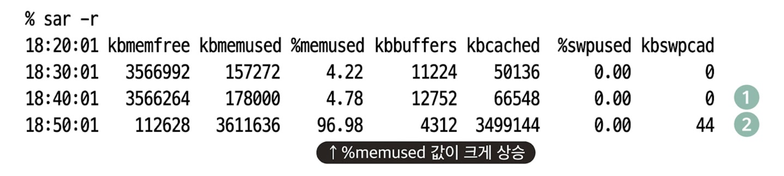 실제 사례를 들어보겠습니다. 그림 3.9도 마찬가지로 sar -r로 본 메모리이며, 이는 캐시가 투과적으로 작용한다는 것을 나타내고 있습니다. ❷행을 보면 갑자기 메모리 사용량이 96.98%로 올라가고 있습니다.